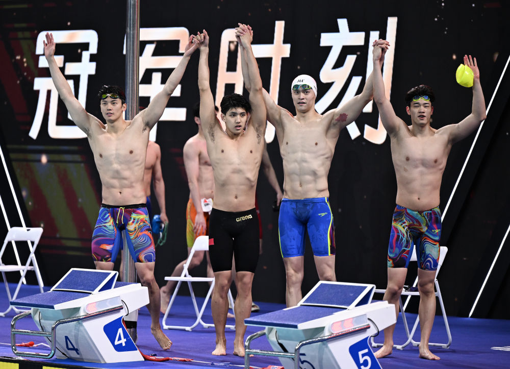 男子4X200米自由泳接力決賽,由汪順、費立緯、孫楊和潘展樂組成的浙江隊以7分12秒76的成績奪冠。第一棒汪順為浙江隊建立優(yōu)勢,交接時已超出第二名一個身位,此后費立緯繼續(xù)擴大領(lǐng)先,孫楊和潘展樂沒有給對手追趕的機會,浙江隊以領(lǐng)先第二名超過3秒的優(yōu)勢奪冠。山東隊和公安體育協(xié)會隊分列二、三位。