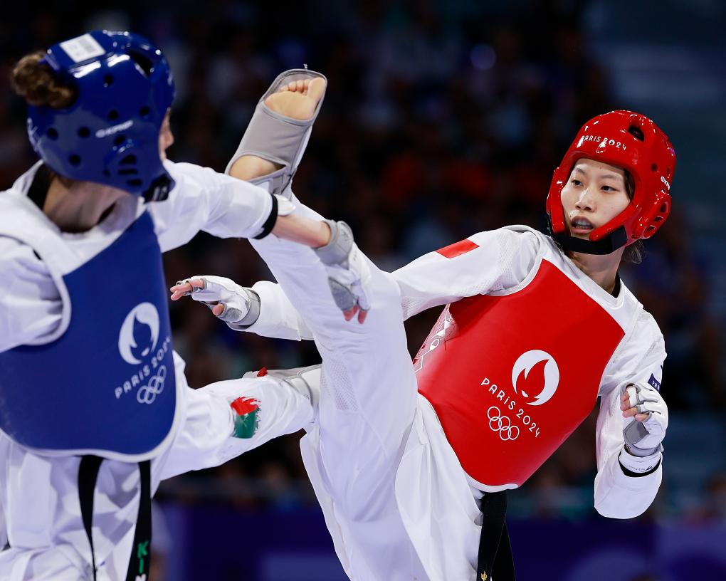 2024年8月8日,中國選手駱宗詩(右)在巴黎奧運(yùn)會跆拳道項(xiàng)目女子57公斤級銅牌賽上。新華社記者 費(fèi)茂華 攝