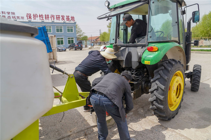 △在吉林省四平市梨樹(shù)縣康達(dá)農(nóng)機(jī)農(nóng)民專業(yè)合作社,農(nóng)民在調(diào)試免耕播種機(jī)。