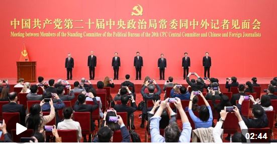 10月23日,剛剛在黨的二十屆一中全會(huì)上當(dāng)選的新一屆中共中央政治局常委,在人民大會(huì)堂同采訪中共二十大的中外記者親切見面。