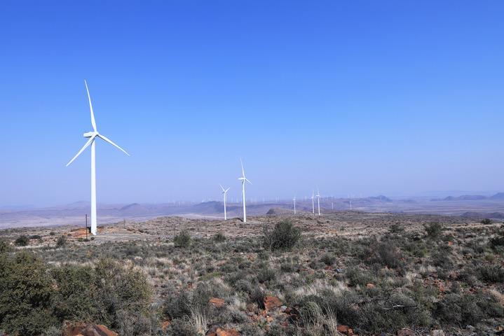 這是8月10日在南非北開(kāi)普省德阿鎮(zhèn)拍攝的中國(guó)國(guó)家能源集團(tuán)龍?jiān)措娏δ戏枪具\(yùn)營(yíng)的德阿風(fēng)電項(xiàng)目風(fēng)機(jī)。新華社記者 董江輝 攝