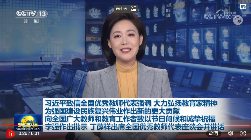全國(guó)優(yōu)秀教師代表座談會(huì)9月9日在京召開(kāi)。中共中央總書(shū)記、國(guó)家主席、中央軍委主席習(xí)近平致信與會(huì)教師代表,在第三十九個(gè)教師節(jié)到來(lái)之際,代表黨中央,向他們和全國(guó)廣大教師及教育工作者致以節(jié)日的問(wèn)候和誠(chéng)摯的祝福。