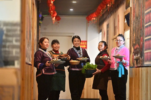 2025年2月28日,在廣西柳州市融水苗族自治縣融水鎮(zhèn)一家餐館,負(fù)責(zé)人吳葵花(中)和員工展示菜品。吳葵花經(jīng)營(yíng)餐館22年,長(zhǎng)期為當(dāng)?shù)剞r(nóng)村群眾提供穩(wěn)定就業(yè)崗位,并收購(gòu)偏遠(yuǎn)山區(qū)群眾種植的蔬菜。在廣西大山里,一批女能人活躍在農(nóng)村電商、民宿餐飲、鄉(xiāng)村文旅等各個(gè)領(lǐng)域,帶動(dòng)留守婦女發(fā)展產(chǎn)業(yè),實(shí)現(xiàn)就近居家就業(yè)創(chuàng)業(yè)。新華社記者 黃孝邦 攝