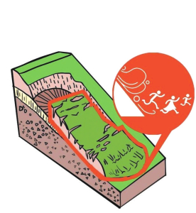 2.坡下行人如遇崩塌應向崩塌體下方的兩側方向迅速逃離。一定不要順著滾石方向撤離,注意保護頭部。