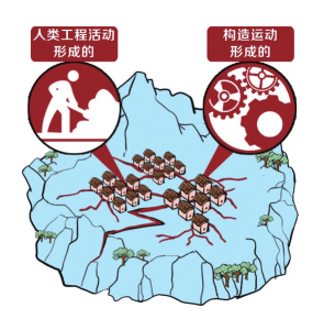 地裂縫的成因有兩大類,第一種是內動力,由構造運動形成的,比如地震等自然因素;另一種是外動力,由人類工程活動形成的,比如松散土體潛蝕、膨脹土脹縮等形成地裂縫。還有一種是人類過量抽汲承壓水導致的地裂縫。