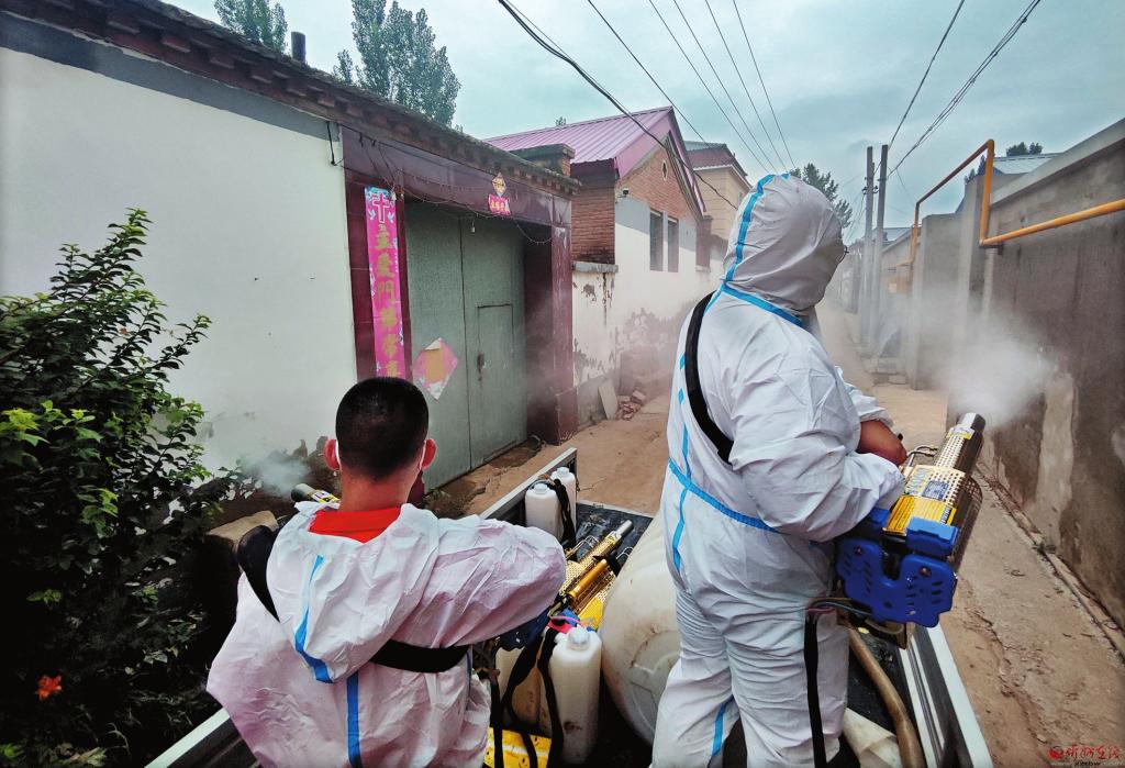 河北涿州發(fā)生暴雨洪澇災害后,我市天龍救援隊響應號召,攜帶專業(yè)救援設備迅速奔赴當地救援,大家沖鋒在前,積極投入抽水、排污、清淤、搬運物資、消殺等工作中。圖為8月7日在該市刁窩鎮(zhèn),民盟盟員、救援隊隊員王宇龍(右一)和隊友在進行街巷消殺。(焦未軍攝)