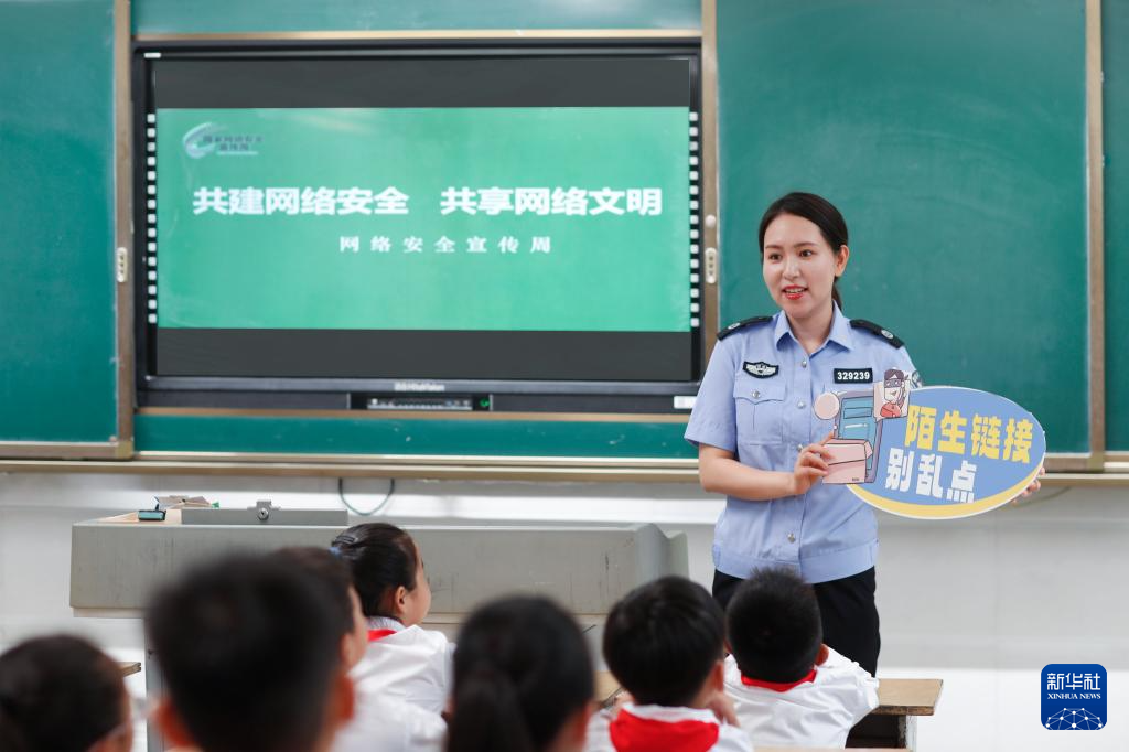 9月11日,公安民警在貴州省銅仁市玉屏侗族自治縣印山民族小學(xué)給學(xué)生講解網(wǎng)絡(luò)安全知識。(新華社發(fā) 胡攀學(xué) 攝)