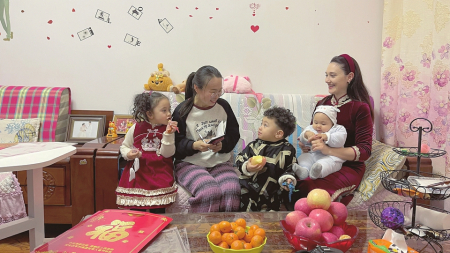 臨汾記者站記者郭玉琴(左二)在臨汾市水門街采訪“洋媳婦”扎拉過(guò)中國(guó)年。