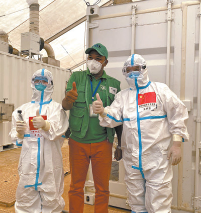 2020年9月2日,在幾內(nèi)亞首都科納克里的一個核酸檢測取樣點,中國抗疫醫(yī)療專家組成員與當(dāng)?shù)毓ぷ魅藛T合影。新華社發(fā)