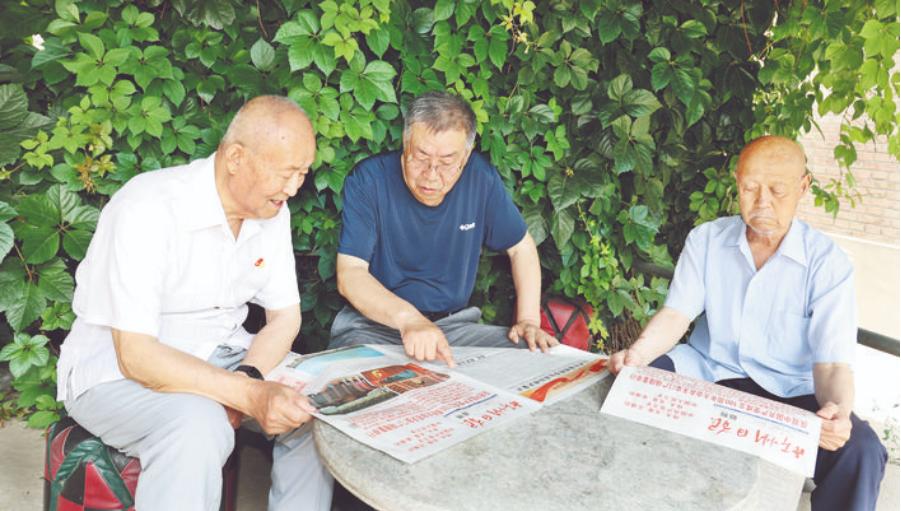 7月5日,在原市廣播局家屬院,老黨員們正在學(xué)習(xí)習(xí)近平總書記“七一”重要講話。(張存良 攝)