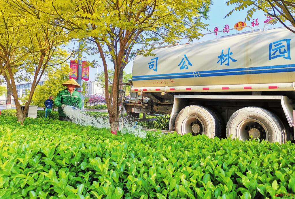 5月21日,園林工人在忻州城區(qū)長征西街澆灌綠化帶。近期氣溫上升,苗木需水量變大,園林工人每天三次為綠植補(bǔ)充水分,確保文明城市花園綠地郁郁蔥蔥。 (宮清華 攝)