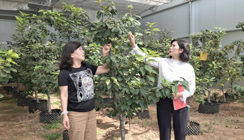 新路村黨支部書記、村委會(huì)主任劉翠萍與“櫻桃樹下”種植園有關(guān)負(fù)責(zé)人察看櫻桃長(zhǎng)勢(shì)。張林泉 攝