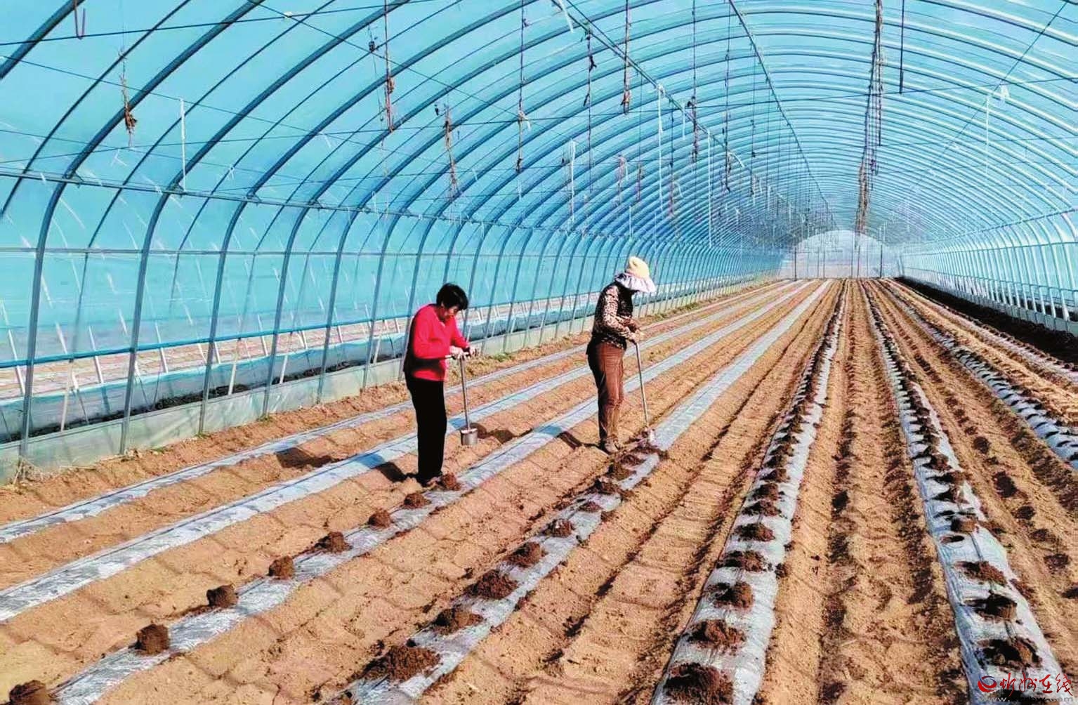 陽(yáng)春三月,春風(fēng)拂過(guò)雙乳山,西大王村的豆角產(chǎn)業(yè)園迎來(lái)豆角種植好時(shí)機(jī)。大棚里,六七個(gè)工人有序作業(yè),有的在點(diǎn)坑穴,有的在撒種、填土。一個(gè)大棚種好后,打開(kāi)閥門(mén),水流順著地上的滴管涌到坑穴,為剛?cè)鱿碌姆N子提供水分。據(jù)了解,西大王村采用“黨支部+集體經(jīng)濟(jì)合作社+農(nóng)戶(hù)”的發(fā)展模式,既為集體增收,又讓村民受益。今年,豆角種植園區(qū)一共有13個(gè)大棚,占地約40畝。為了搶抓農(nóng)時(shí),提前上市,賣(mài)個(gè)好價(jià)格,此次播種雇了許多村民幫忙,播種大約需要半個(gè)月時(shí)間才能完成。