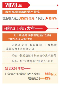 省工信廳日前發(fā)布《山西省高端裝備制造產(chǎn)業(yè)鏈2024年行動(dòng)計(jì)劃》,確立年度推進(jìn)目標(biāo):以軌道交通、智能煤機(jī)、工程機(jī)械等領(lǐng)域?yàn)橹饕l(fā)展方向,突破一批高端裝備制造核心技術(shù)瓶頸,培養(yǎng)一批“專精特新”“小巨人”企業(yè),提升全產(chǎn)業(yè)鏈科技創(chuàng)新能力,強(qiáng)化高端裝備制造供應(yīng)鏈穩(wěn)定性和配套能力。并提出,到2024年底,力爭(zhēng)全產(chǎn)業(yè)鏈營(yíng)業(yè)收入突破950億元,增速達(dá)到12%。