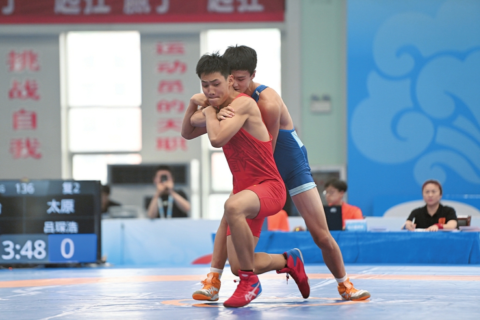 8月17日,省第十六屆運動會古典式摔跤比賽舉行,運動員們進行技術與力量的比拼。本報記者阮洋攝