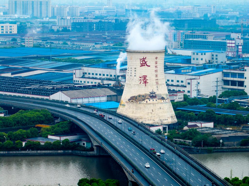圖為位于蘇州市吳江區(qū)盛澤鎮(zhèn)南三環(huán)高架橋一側的白色冷卻塔。(高剛攝)
