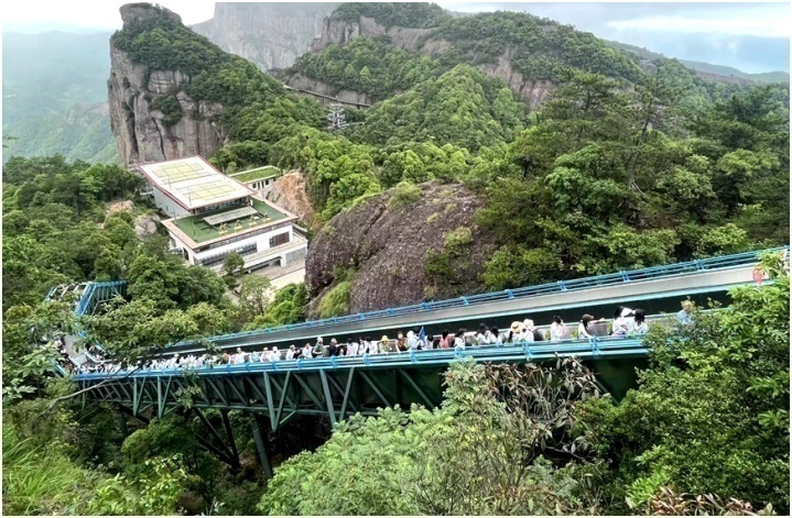 5月27日,在浙江省仙居縣神仙居景區(qū),游客絡(luò)繹不絕,排隊搭乘纜車和自動扶梯上山觀景。