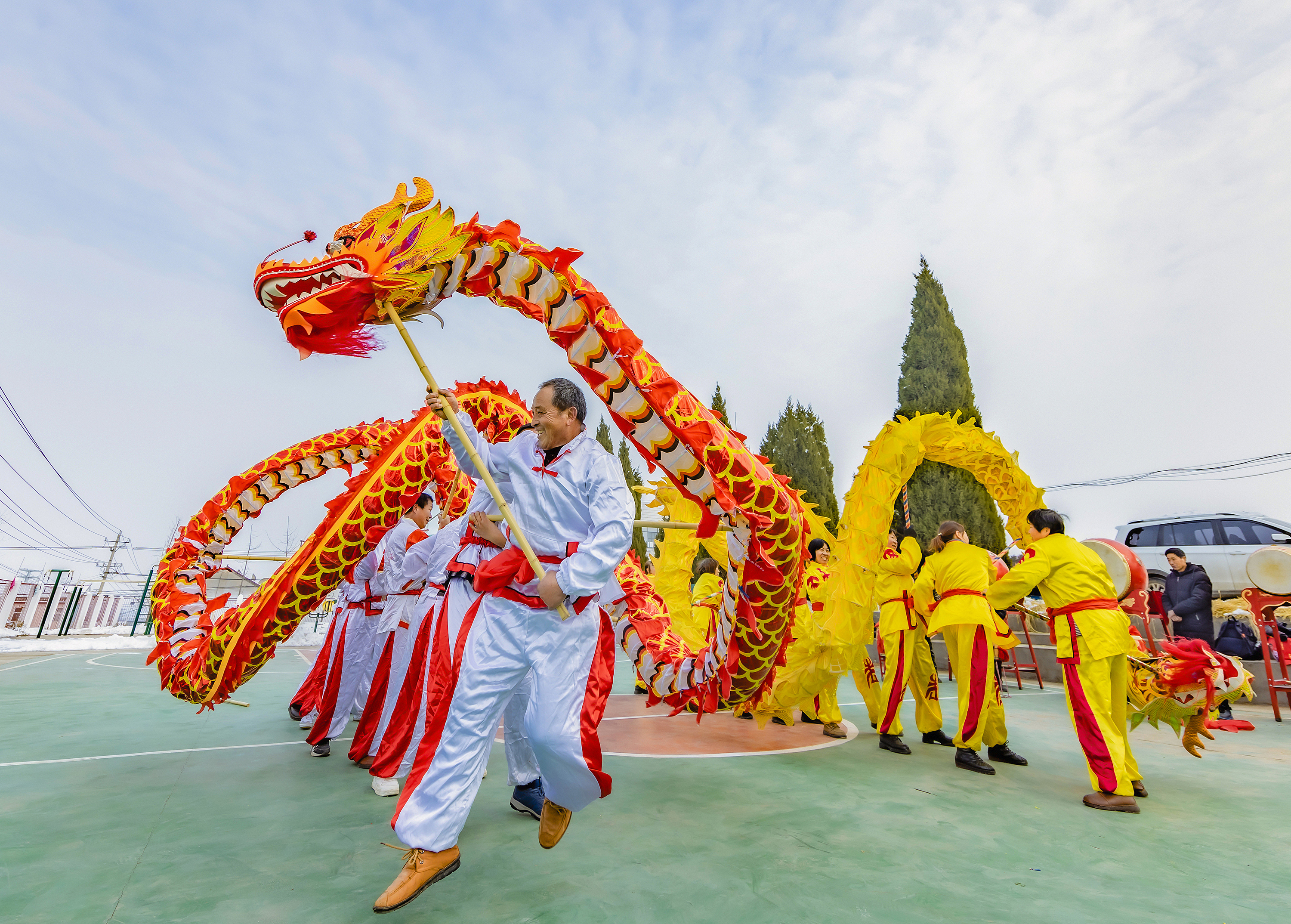 △ 江蘇宿遷兩支舞龍隊正在為村民表演雙龍狂舞鬧新春。