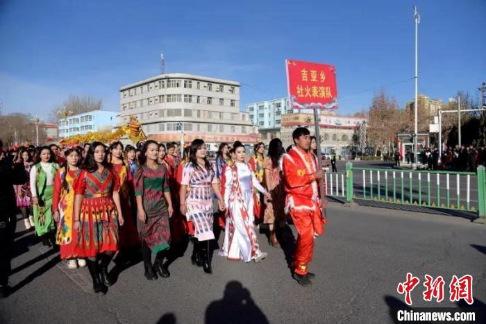2月12日,農(nóng)歷正月初三,和田市舉行2024年“龍騰盛世·春滿萬(wàn)家”社火活動(dòng)。圖為和田市吉亞鄉(xiāng)社火表演隊(duì)巡街。張亞輝 攝