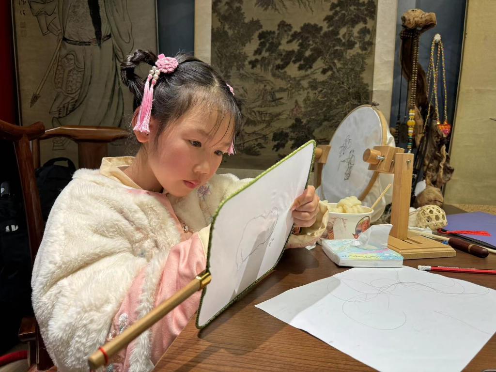 在贛發(fā)繡非遺展臺(tái),風(fēng)景、人物、福龍等刺繡作品栩栩如生。游客們以繡針為筆,以發(fā)絲為線,在團(tuán)扇扇面上進(jìn)行刺繡。