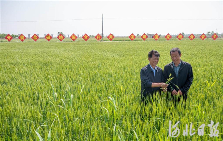 2023年5月,河北省滄州市黃驊市舊城鎮(zhèn)仙莊片區(qū)旱堿地麥田,后仙莊村村民楊東進(jìn)(右)和后仙莊村黨支部副書記劉玉鎖一起查看旱堿麥生長狀況。 河北日?qǐng)?bào)記者 趙杰 攝