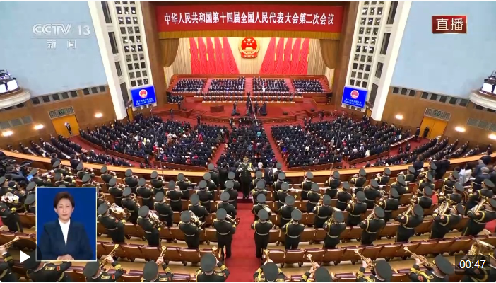 3月5日上午9時,十四屆全國人大二次會議在人民大會堂開幕,全體起立,高唱中華人民共和國國歌。