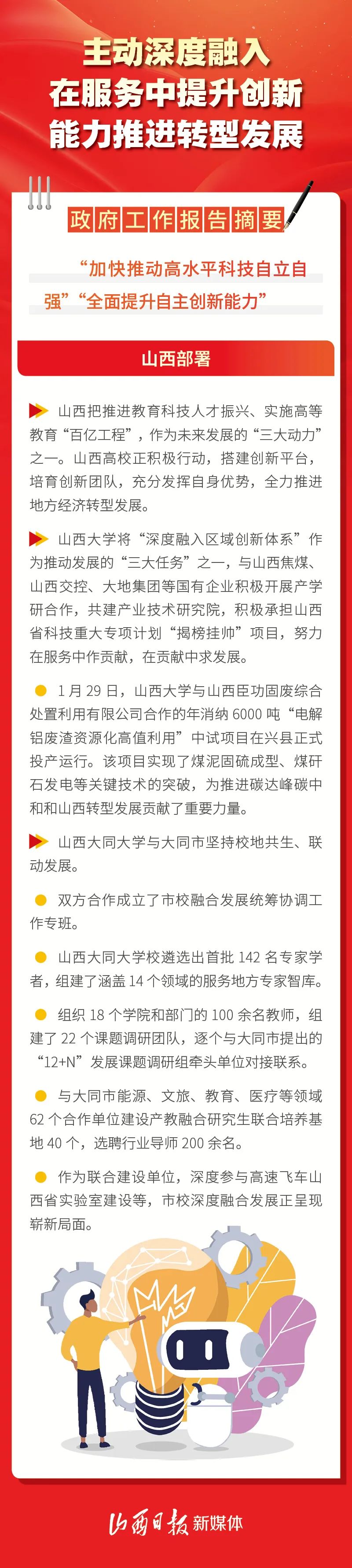 今年政府工作報告指出,堅(jiān)持教育強(qiáng)國、科技強(qiáng)國、人才強(qiáng)國建設(shè)一體統(tǒng)籌推進(jìn),創(chuàng)新鏈產(chǎn)業(yè)鏈資金鏈人才鏈一體部署實(shí)施。這為山西高校更好地服務(wù)全省各地轉(zhuǎn)型發(fā)展、高質(zhì)量發(fā)展提供了遵循。