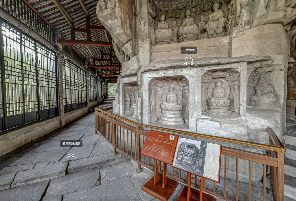 大足石刻數(shù)字博物館中的三世佛龕實景圖。(大足石刻數(shù)字博物館官網(wǎng)截圖)