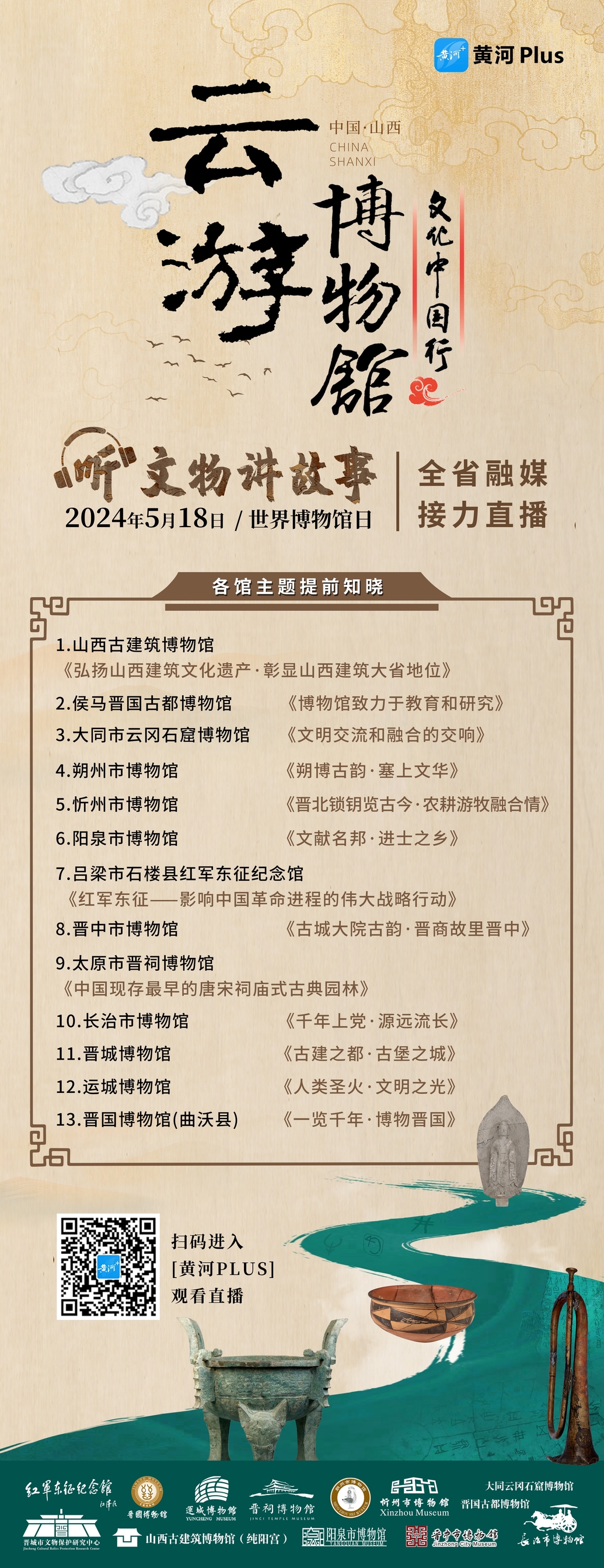 5月18日是世界博物館日,山西廣播電視臺視聽融媒體中心聯(lián)合全省11市廣電融媒體平臺,共同發(fā)起《云游博物館 聽文物講故事》全省融媒接力直播活動(dòng),邀請文物專家、學(xué)者、博物館工作人員,帶大家一起云游太原市晉祠博物館、運(yùn)城博物館、大同市云岡石窟博物館、朔州市博物館、忻州市博物館、陽泉市博物館、晉中市博物館、長治市博物館、晉城博物館、侯馬晉國古都博物、晉國博物館(曲沃縣)、呂梁市石樓縣紅軍東征紀(jì)念館、山西古建筑博物館等13座特色博物館,圍繞13個(gè)博物館不同的主題,用線上直播的形式,講述藏品背后的文明密碼,助力公眾加深對博物館的了解,鑒賞山西豐富的館藏文物,感受中華文明中的山西貢獻(xiàn)。