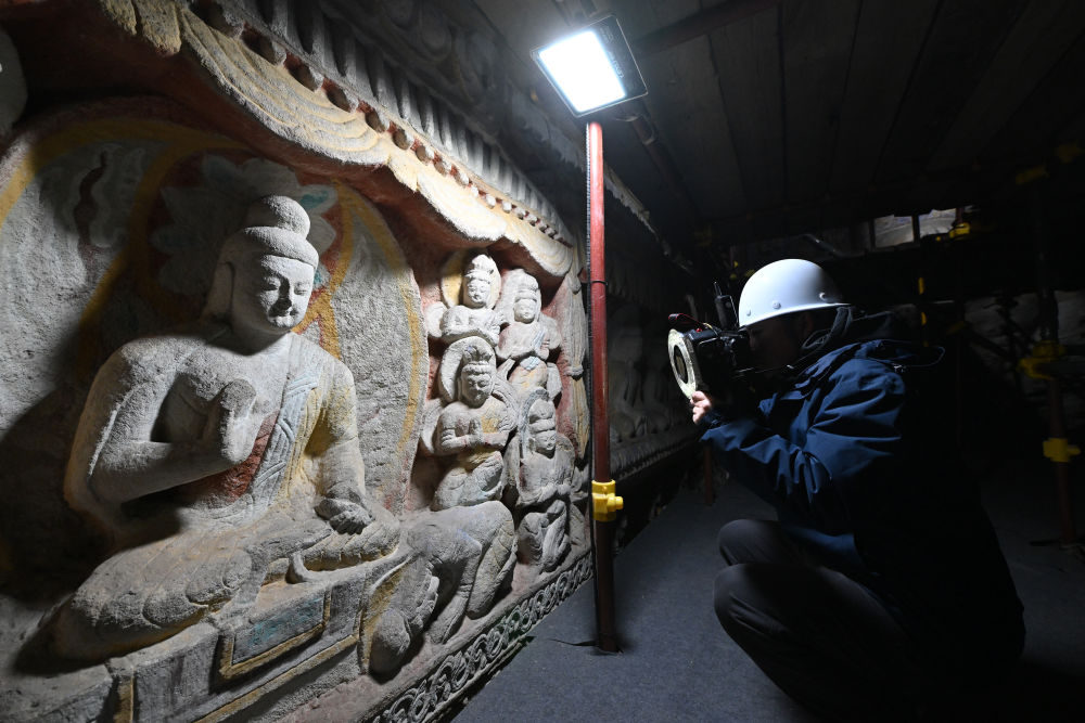工人們?cè)谛扪a(bǔ)石佛(資料照片)。