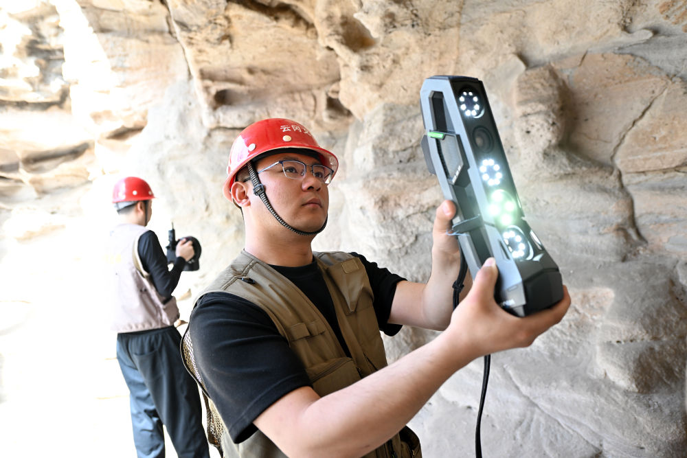 4月16日,云岡研究院數(shù)字化保護(hù)中心工作人員王超(左)在云岡石窟進(jìn)行數(shù)字化信息采集。