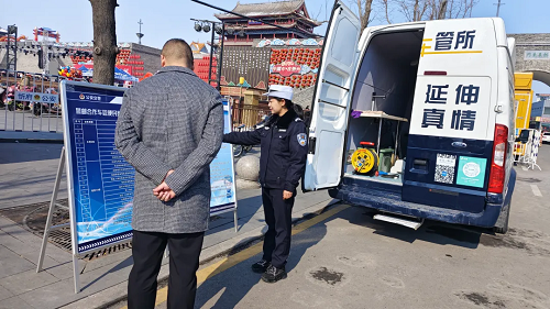 春節(jié)假期,城市、鄉(xiāng)村到處都彌漫著歡樂祥和的氣氛,初一至初七,在山西省忻州市忻府區(qū)光明西街古城北廣場、公園西街世紀花苑小區(qū)南門等人流量大、人員集中場所,忻州市公安局交警支隊的警郵車管便民服務車格外顯眼?!翱s短距離、延伸真情”,這輛承載著為駕駛?cè)颂峁崆橹艿椒?、為車輛安全出行提供保障,被群眾稱為“流動車管所”的車管便民服務車讓寒冬暖流涌動。