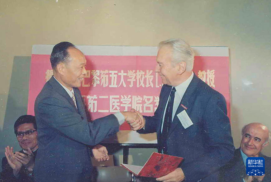 上海第二醫(yī)學院(現上海交通大學醫(yī)學院)校長王振義(前左)授予法國巴黎第五大學校長歐基埃名譽教授稱號(攝于1985年)。新華社發(fā)(上海交通大學醫(yī)學院供圖)