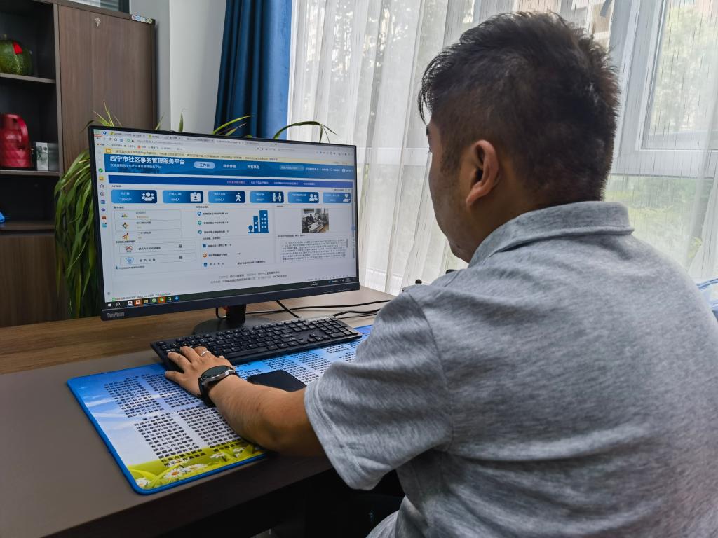7月7日,青海省西寧市城中區(qū)南川西路街道安寧路社區(qū)工作人員正在操作社區(qū)事務(wù)管理服務(wù)平臺。新華社記者 柳澤興 攝