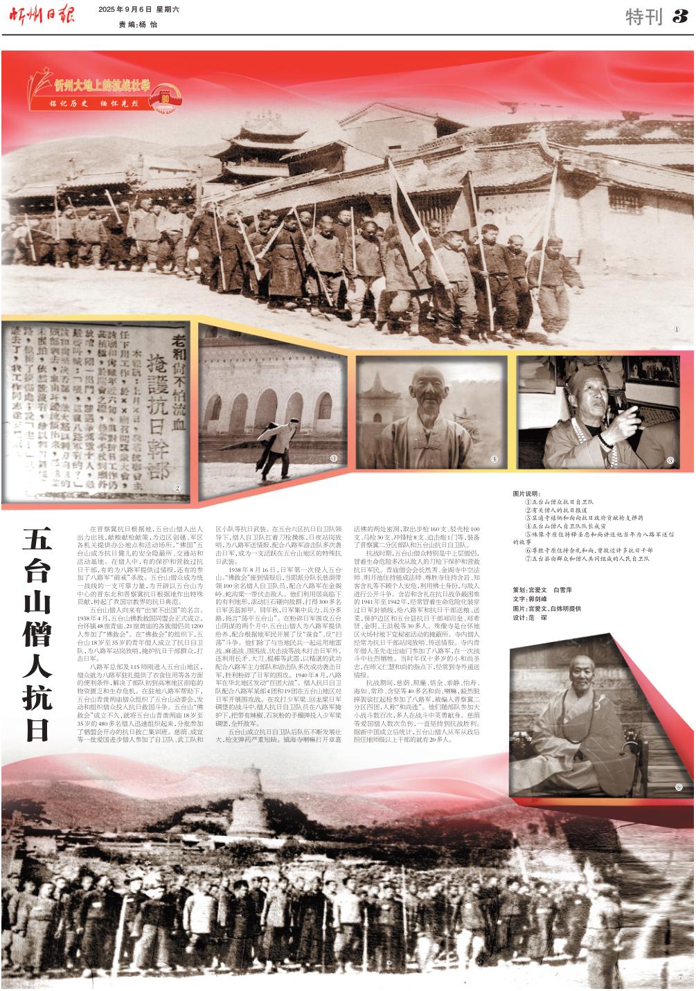 1938年8月16日,日軍第一次侵入五臺山?!胺鹁葧苯拥角閳蠛螅敿磁煞株犻L慈蔭帶領(lǐng)100余名僧人自衛(wèi)隊員,配合八路軍在金閣嶺、蛇溝梁一帶伏擊敵人。他們利用居高臨下的有利地形,滾動巨石砸向敵群,打得300多名日軍丟盔卸甲。同年秋,日軍集中兵力、兵分多路,揚言“蕩平五臺山”。在粉碎日軍圍攻五臺山陰謀的兩個月中,五臺山僧人為八路軍提供給養(yǎng),配合根據(jù)地軍民開展了反“蠶食”、反“掃蕩”斗爭。他們除了與當?shù)孛癖黄疬\用地雷戰(zhàn)、麻雀戰(zhàn)、圍困戰(zhàn)、伏擊戰(zhàn)等戰(zhàn)術(shù)打擊日軍外,還利用長矛、大刀、棍棒等武器,以精湛的武功配合八路軍主力部隊和游擊隊多次成功襲擊日軍,勝利粉碎了日軍的圍攻。1940年8月,八路軍在華北地區(qū)發(fā)動“百團大戰(zhàn)”。僧人抗日自衛(wèi)隊配合八路軍某部4團和19團在五臺山地區(qū)對日軍開展圍攻戰(zhàn)。在攻打少軍梁、回龍梁日軍碉堡的戰(zhàn)斗中,僧人抗日自衛(wèi)隊員在八路軍掩護下,把帶有辣椒、石灰粉的手榴彈投入少軍梁碉堡,全殲敵軍。
